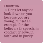 1 Timothy 4:12 NIV [12] Don’t let anyone look down on you because you are young, but set an example for the believers in speech, in conduct, in love, in faith and in purity.