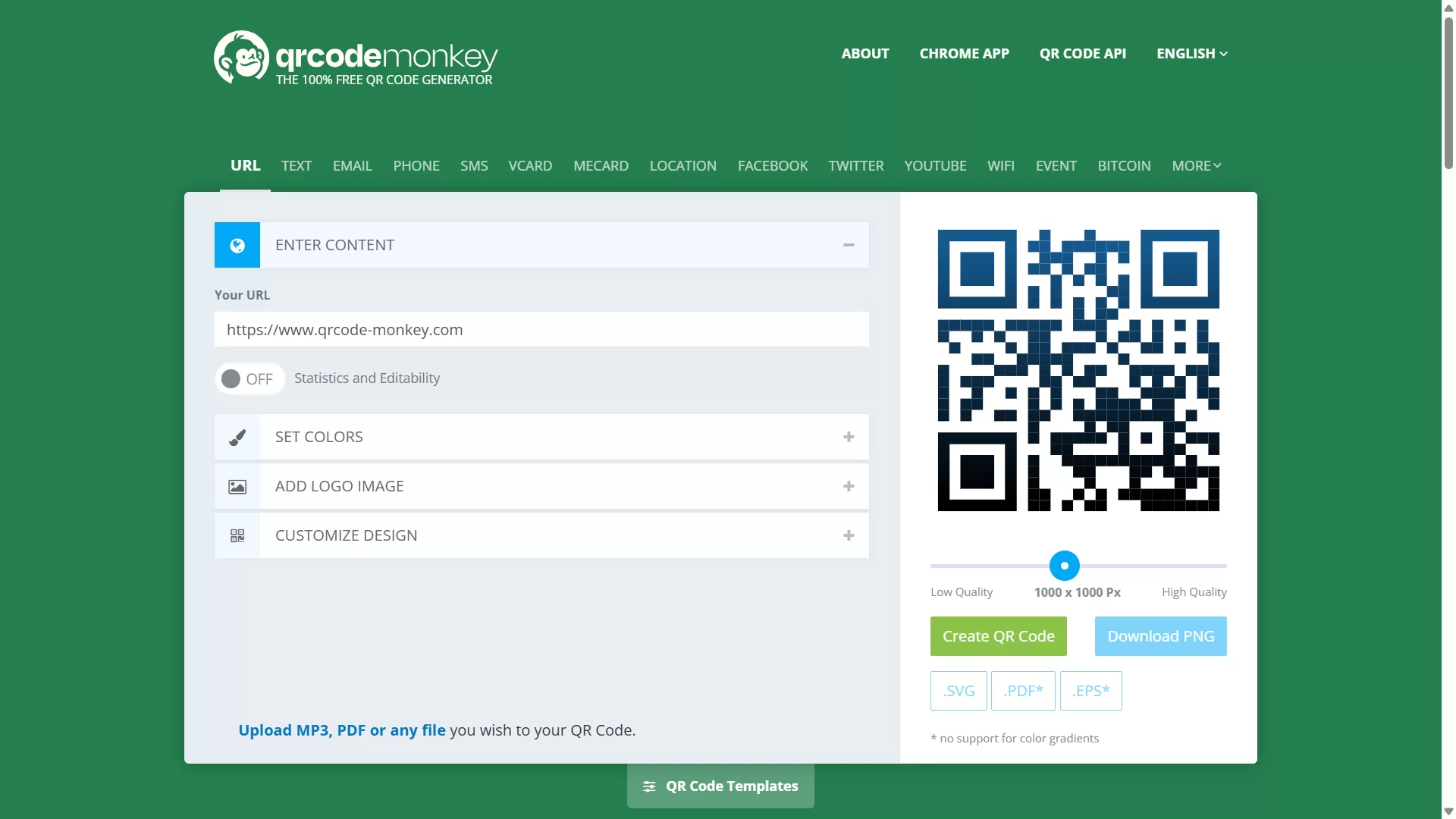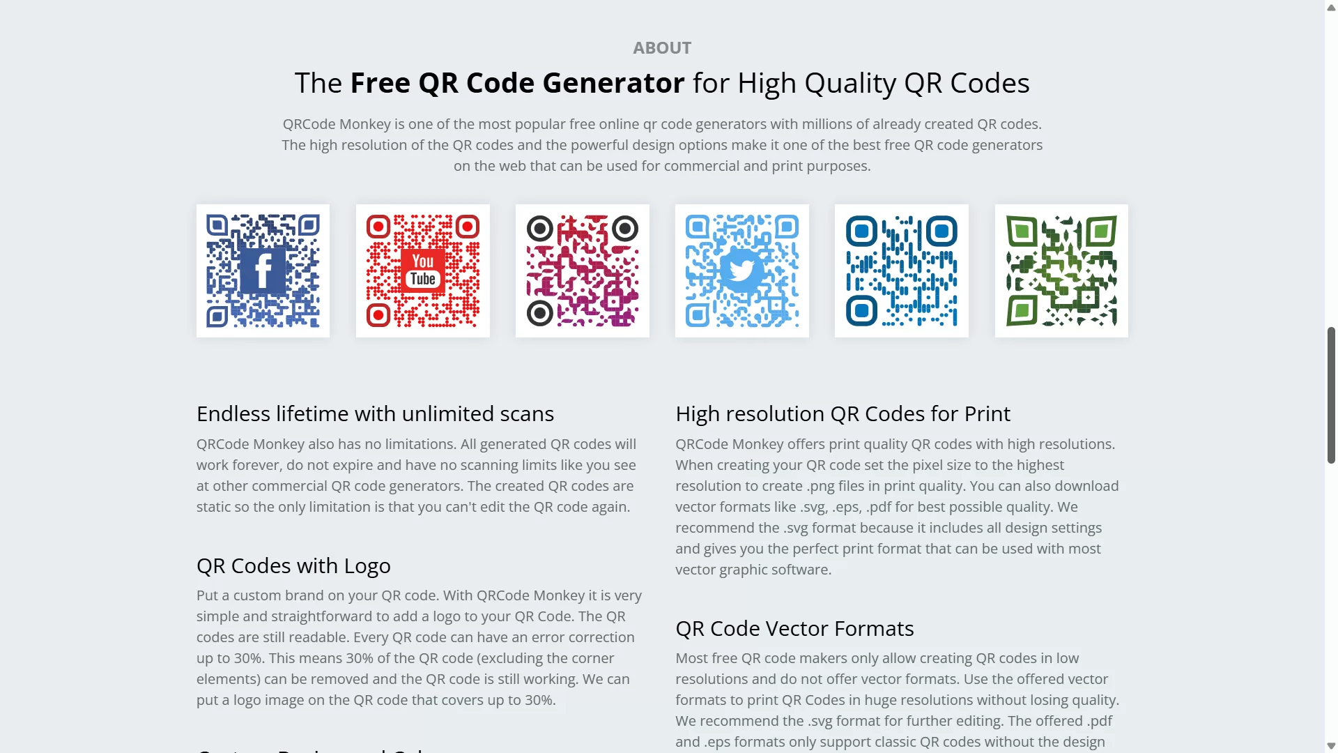 QR Code Monkey is one of the most popular and user-friendly free QR code generators online. You don’t need to create an account, and you can generate unlimited custom QR codes for: