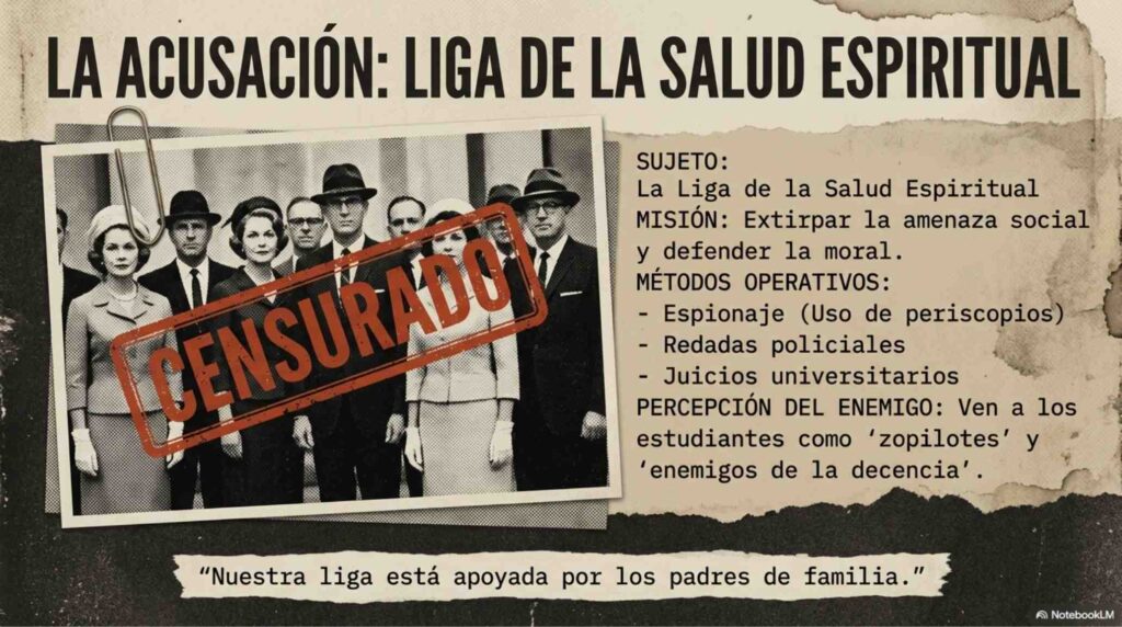 La “Liga de la Salud Espiritual” actúa como un grupo de emprendedores morales que buscan reglamentar el comportamiento privado de los jóvenes bajo una apariencia de orden público. Este organismo opera como el brazo censor que intenta preservar una “austeridad y moderación” que ya no corresponde a la realidad social.