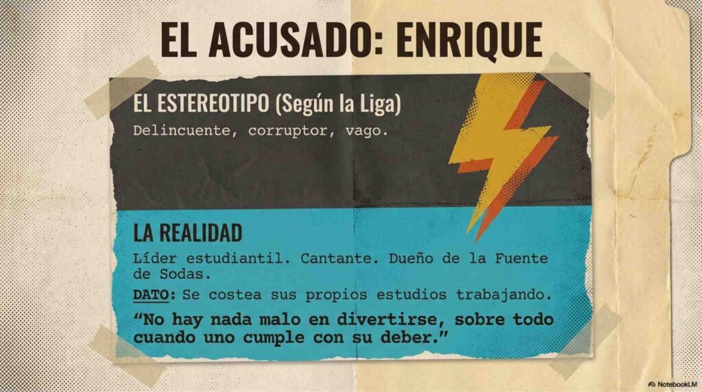 • Enrique: Representa el arquetipo del líder carismático y “dinámico”. Su figura desarticula el prejuicio conservador al demostrar que se puede ser un estudiante responsable y, simultáneamente, un exponente del ritmo. Es el motor de la “resistencia melódica”.