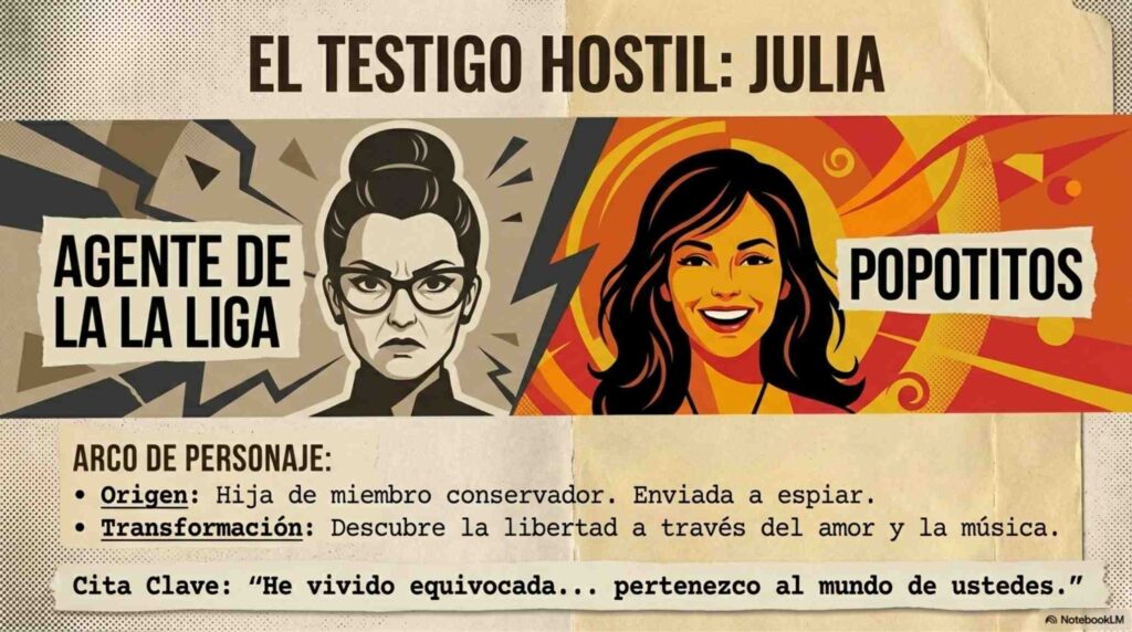 • Julia: Su arco de transformación es el más significativo. Inicialmente motivada por la “envidia” y el celo inquisidor de la Liga, actúa como “espía” y fiscal. Sin embargo, su transición de la vigilancia a la participación activa —al ser conquistada por el “ritmo loco y alegre”— simboliza la capitulación de la censura ante la autenticidad juvenil.